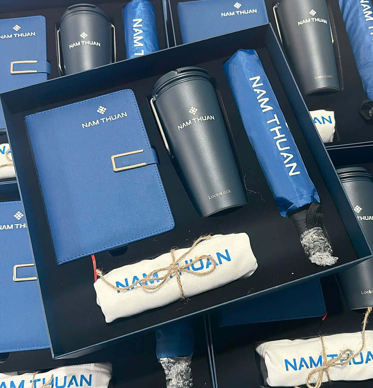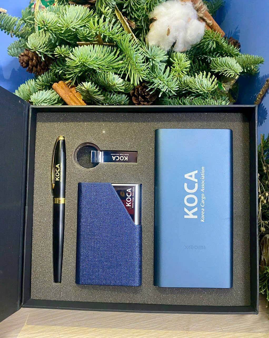 Bộ quà này có thể bao gồm bút, sổ tay, chì kẻ, bình giữ nhiệt và nhiều món đồ khác. Tất cả đều được in logo để nâng cao giá trị thương hiệu và tạo ấn tượng.